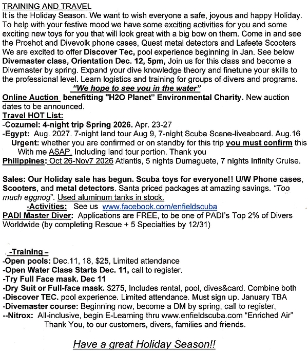 Enfield Scuba and Watersports LLC - December 2025 Newsletter