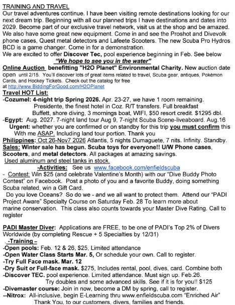 Enfield Scuba and Watersports LLC - February 2026 Newsletter